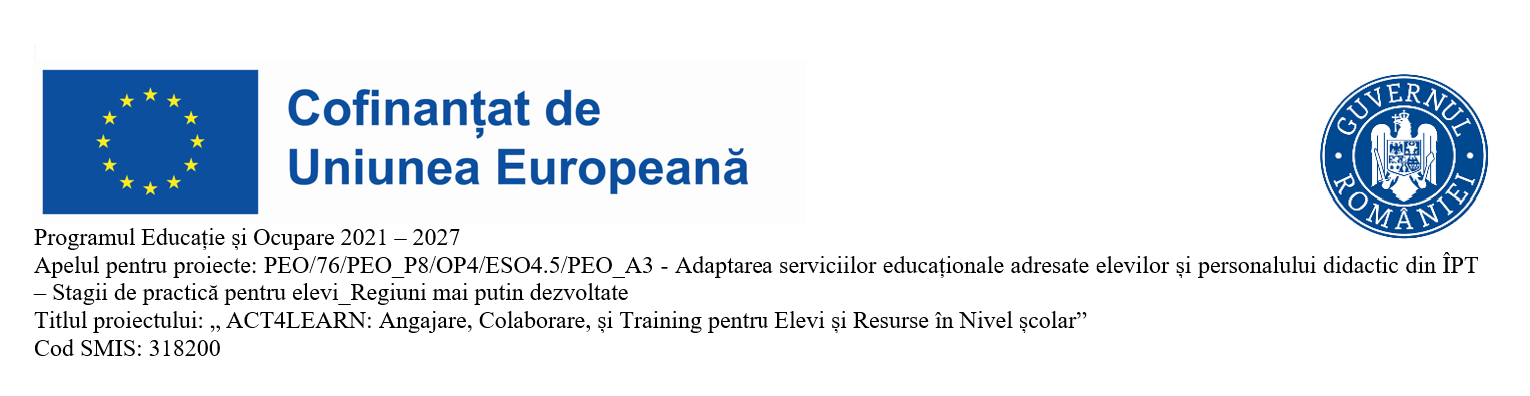 Proiectul ACT4LEARN – Angajare, Colaborare și Training pentru Elevi și Resurse în Nivel școlar (cod SMIS 318200) se derulează în perioada 01.11.2024 – 31.10.2027, având o durată totală de 36 de luni.